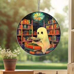 Halloween Ghost Reading Book Acrylic Suncatcher – Cute Window Hanging for Spooky Home Decor