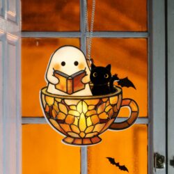 Reading Ghost in Teacup Suncatcher – Halloween Acrylic Window Hanging for Book Lovers
