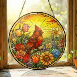 Red Cardinal Spring Suncatcher, Cardinal And Sunflower Stained Glass Decor