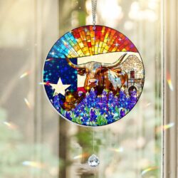 Texas Suncatcher – 1 Layer Window Hanging Home Decor with Texas Longhorn and Bluebonnet