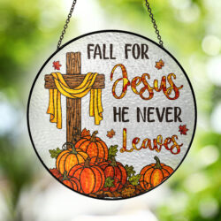 Fall for Jesus He Never Leaves Jesus Cross Thanksgiving Fall Stained Glass Suncatcher MLN6258TMN