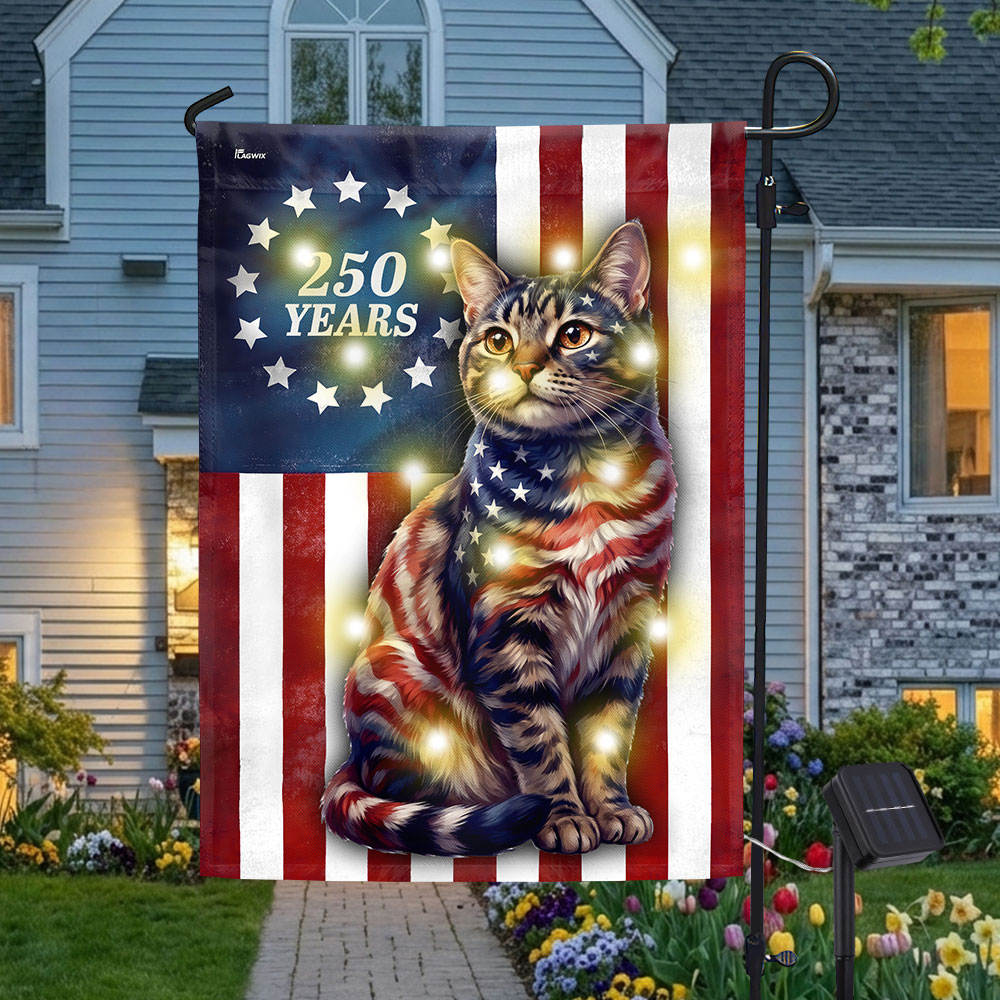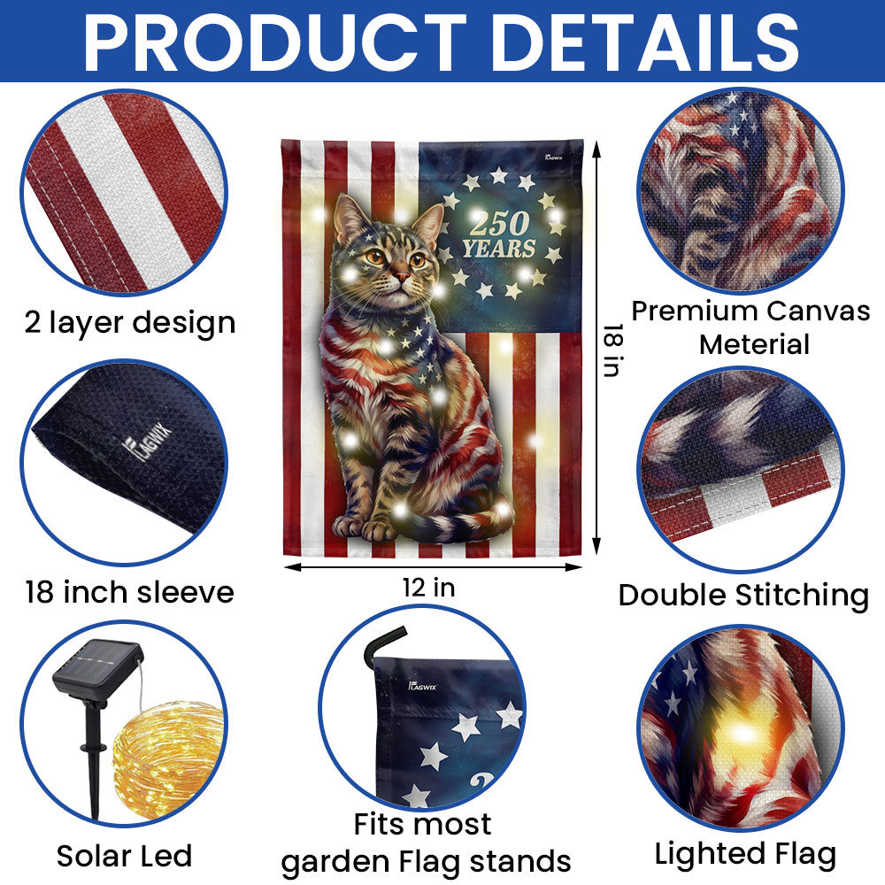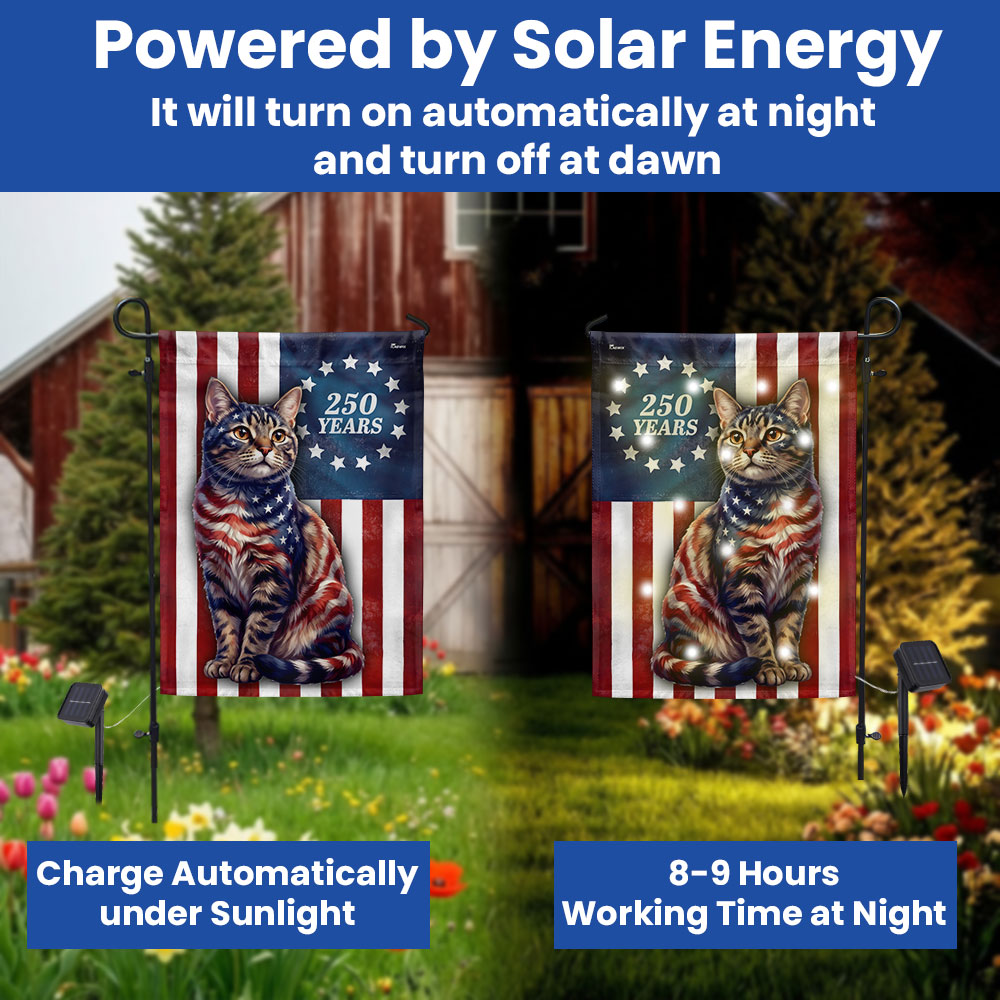 250 Years 1776 2026 Solar LED Flag Decor for Cat Lovers, Patriotic American Cat Garden Flag