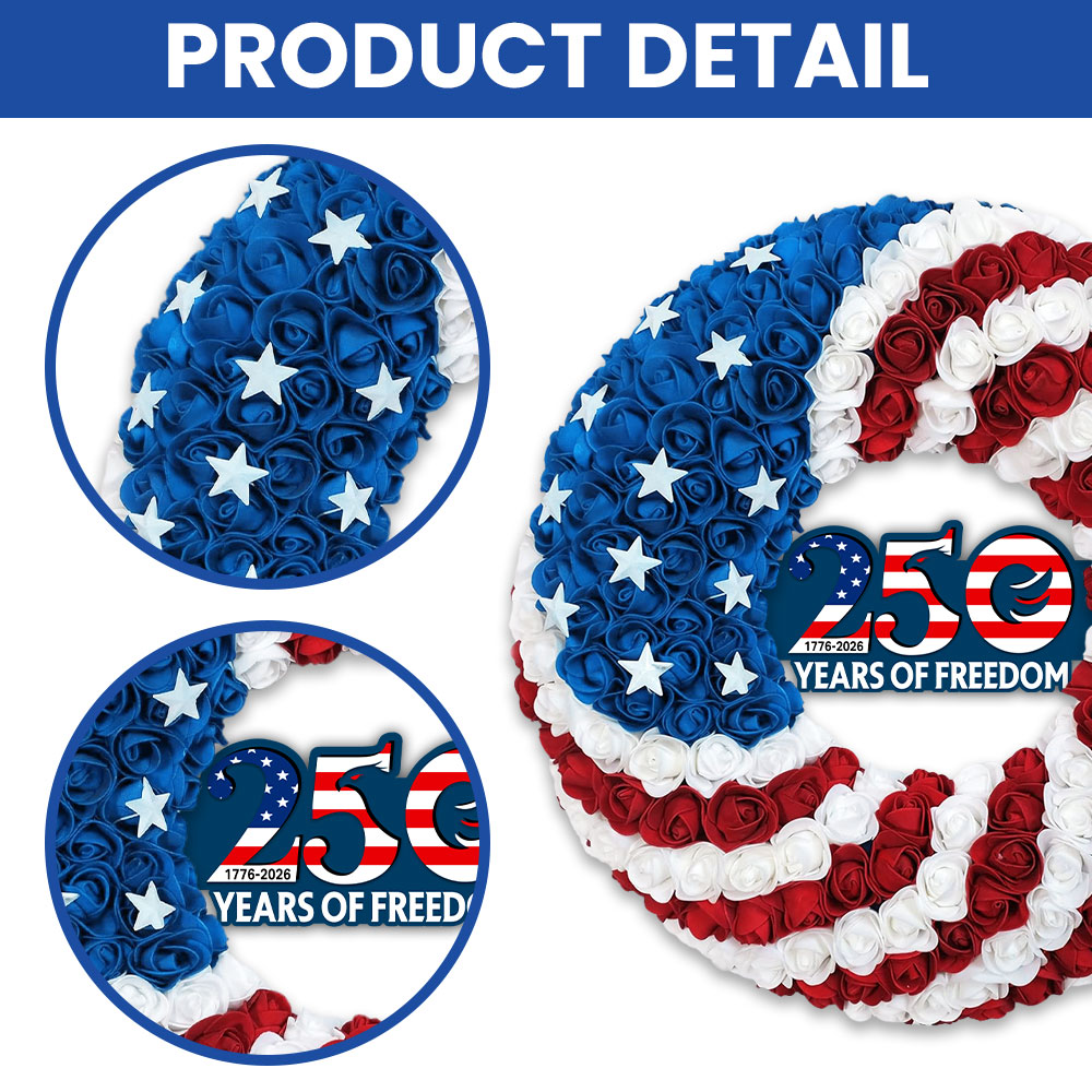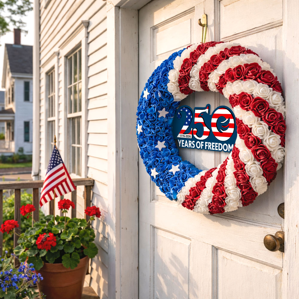 Celebrate your patriotic spirit with this stunning 250th Anniversary American flag wreath. Handcrafted with vibrant red, white, and blue roses, this wreath embodies the colors of the nation, making it an ideal decoration for Independence Day, Memorial Day, Veterans Day, or year-round display.
