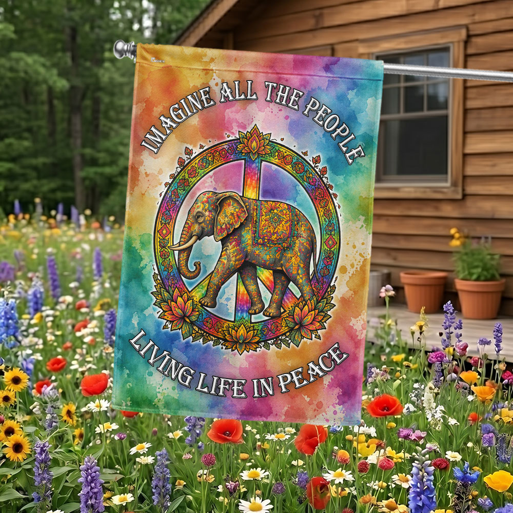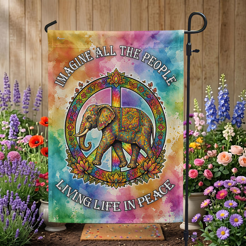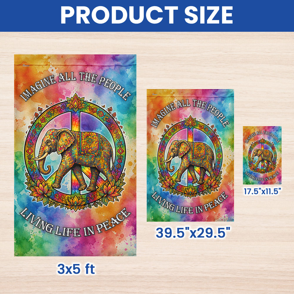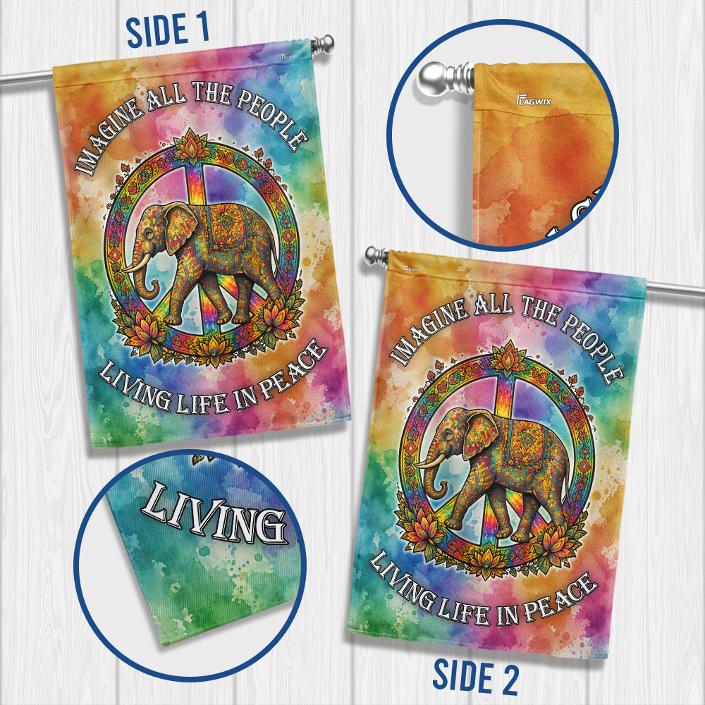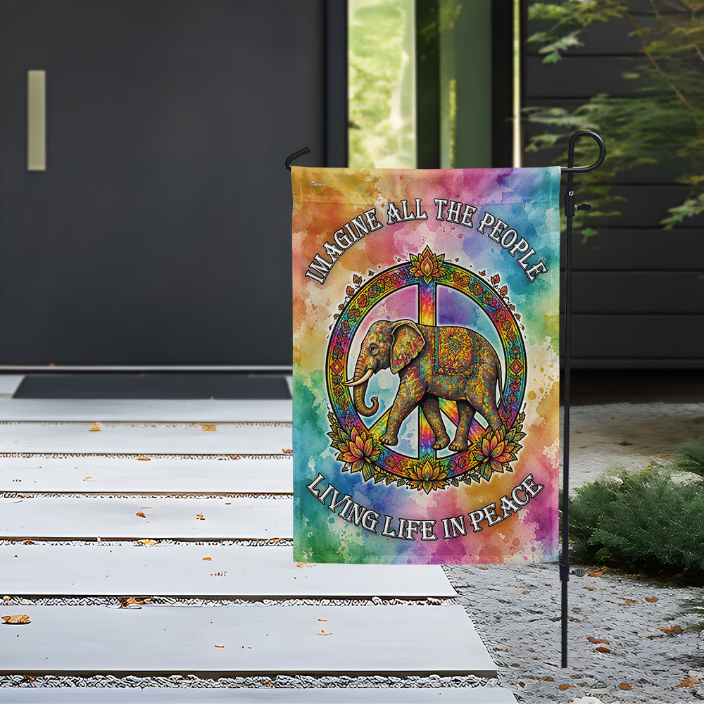 Peace Sign Hippie Elephant Woodstock Garden Flag, Imagine All The People Living Life In Peace Flag Decor