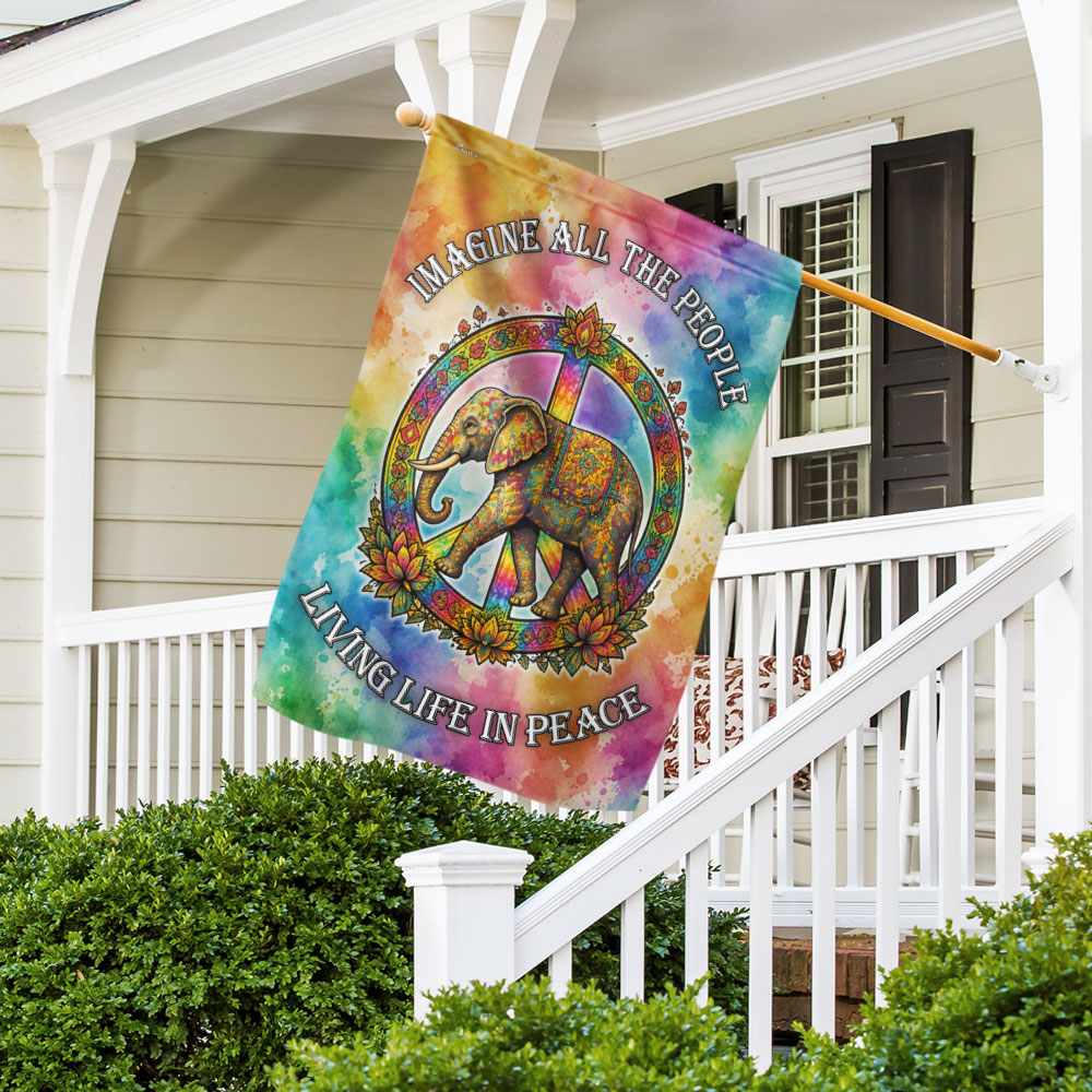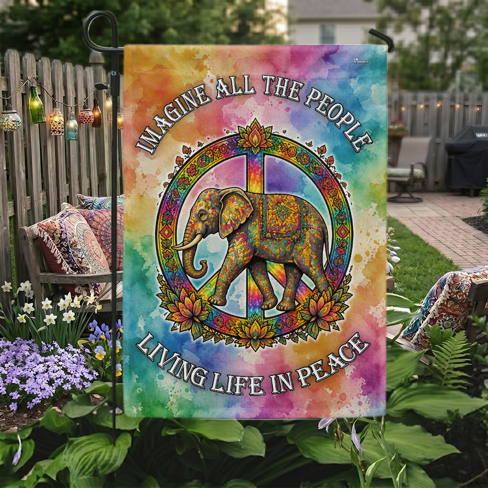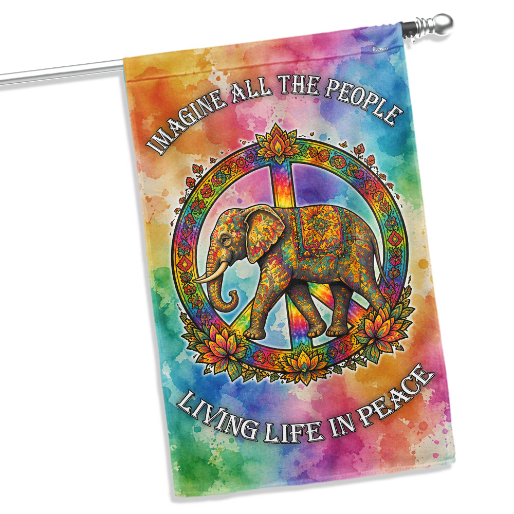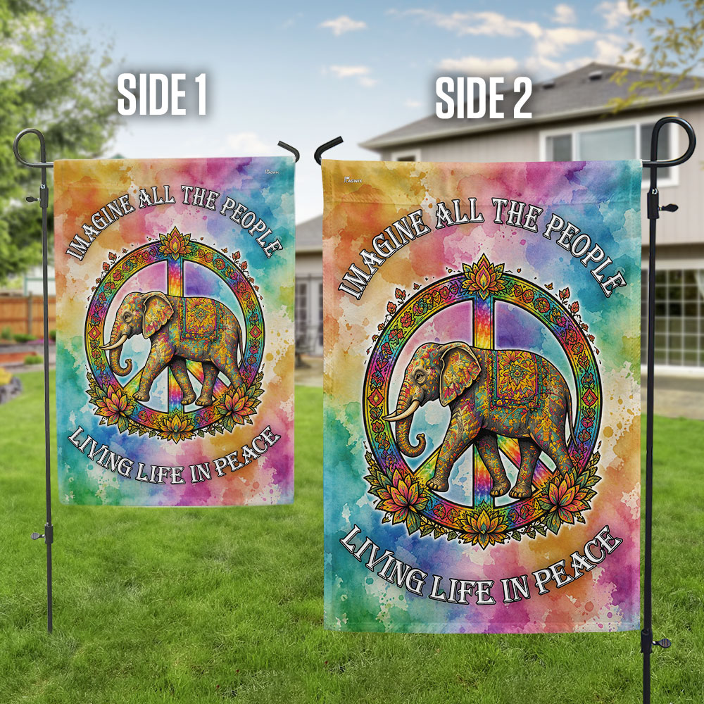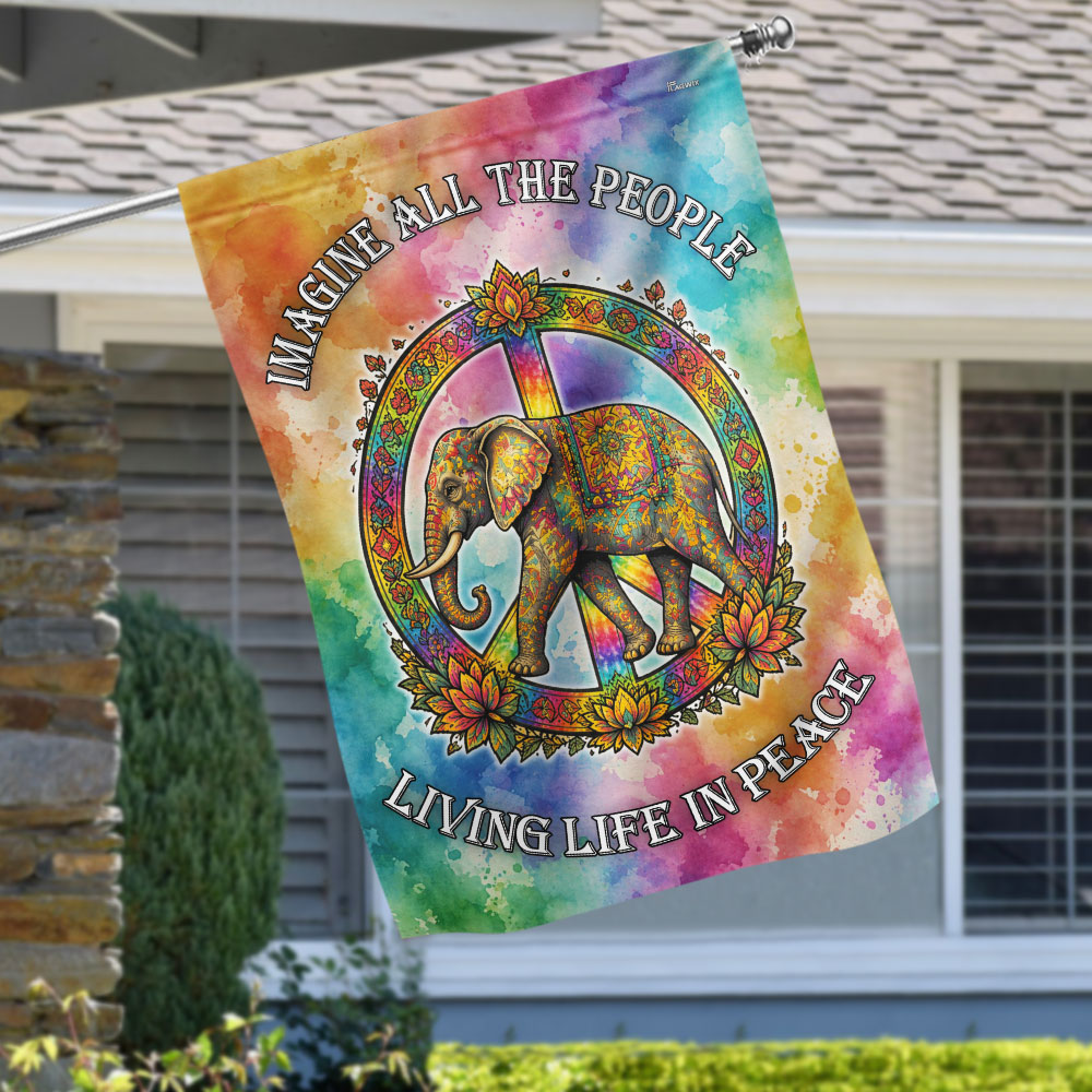 Peace Sign Hippie Elephant Woodstock Garden Flag, Imagine All The People Living Life In Peace Flag Decor