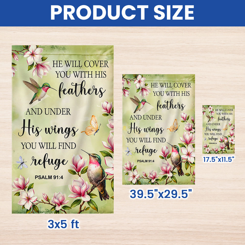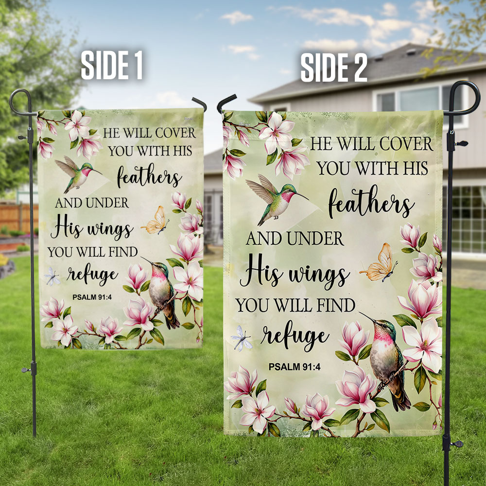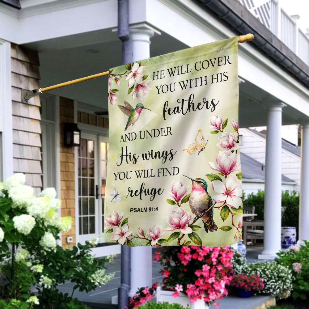 Spring Hummingbird Flag, He will cover you with Feathers Jesus Decor